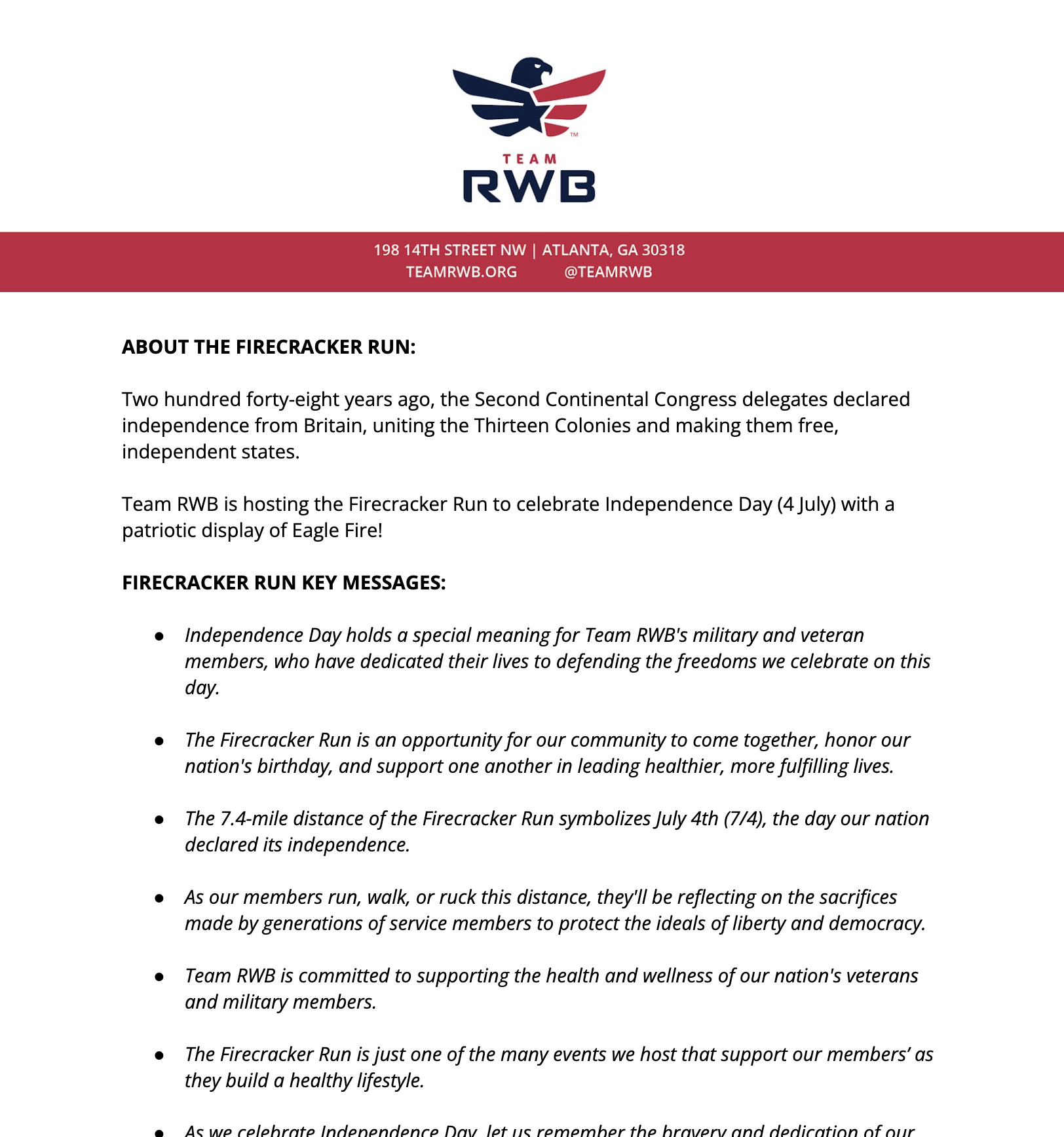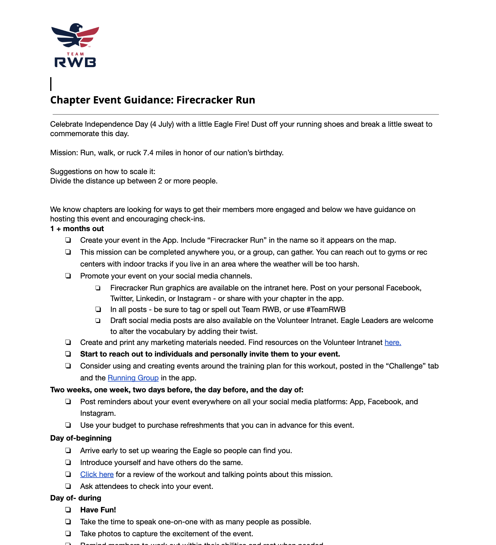 Every month, Eagle Nation rallies to tackle a Monthly Mission that can be completed at in-person events or virtually through the Team RWB Member App. By hosting a mission, you are offering veterans an opportunity to prioritize their health and wellness. This page has all the resources you need to make your event a success.